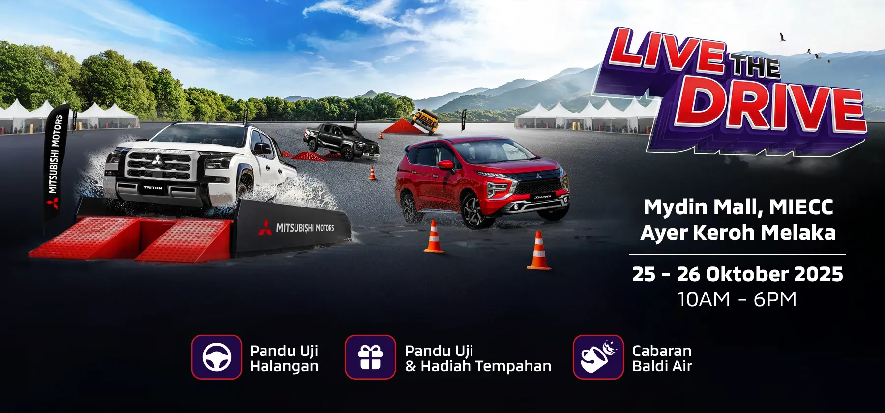 Cabaran halangan kami yang mengujakan direka untuk menonjolkan pengendalian dan prestasi unggul Triton yang memenangi anugerah. Jangan lepaskan Cabaran Baldi Air — satu rintangan laluan berasaskan kemahiran di mana pemanduan yang lancar boleh memenangi hadiah bernilai sehingga RM1,100, termasuk: